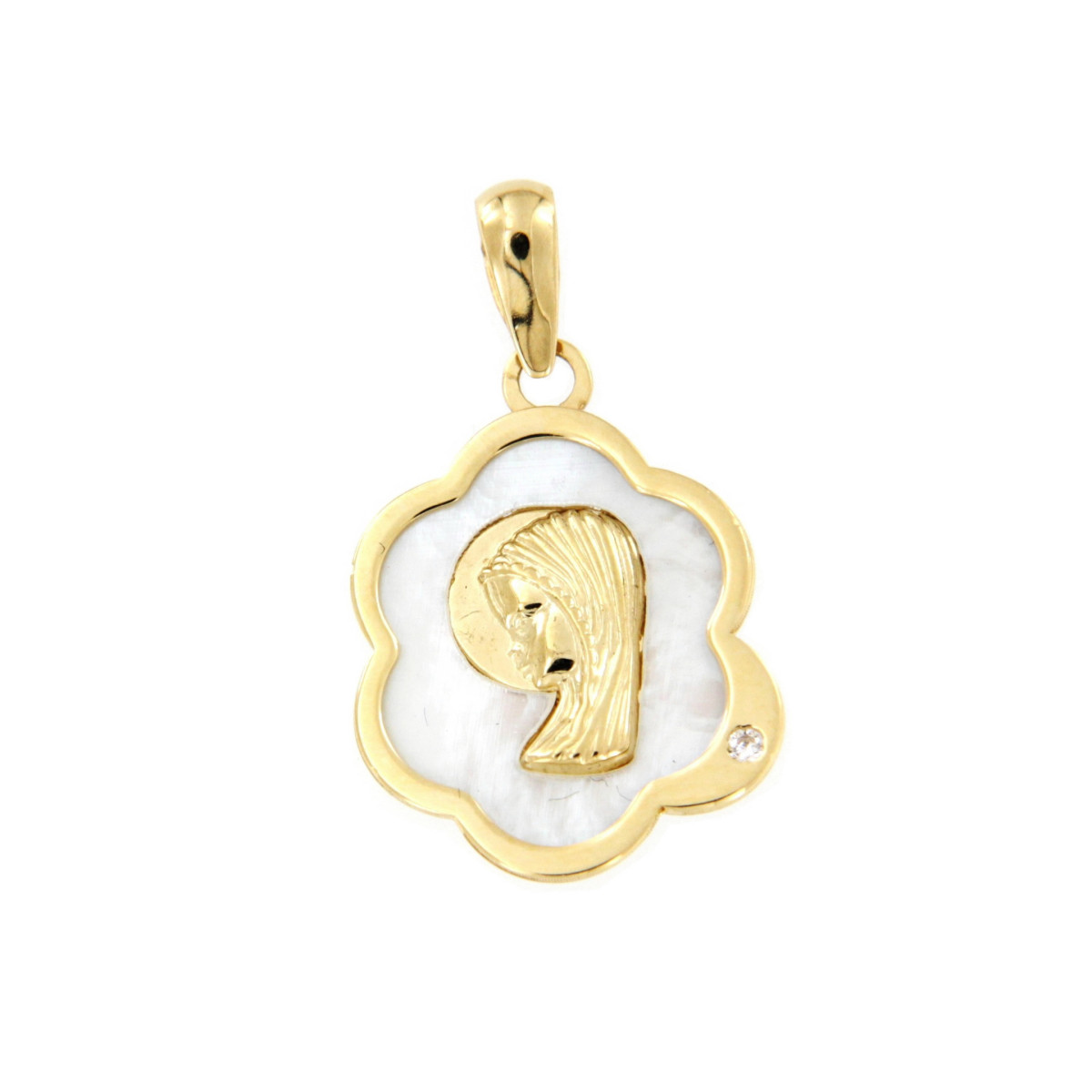 Medalla Virgen Niña de 16 x 12 mm. Fabricada en Oro Amarillo de 18kt con Nacar y Forrada para Grabar.