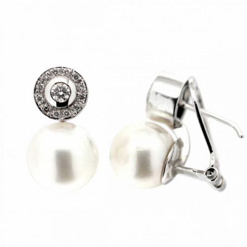Pendientes con 2 Perlas Naturales de 10 mm. y 26 Diamantes Naturales Talla Brillante con un Peso Total de 0,30 Quilates. Tamaño 18 x 10 mm.