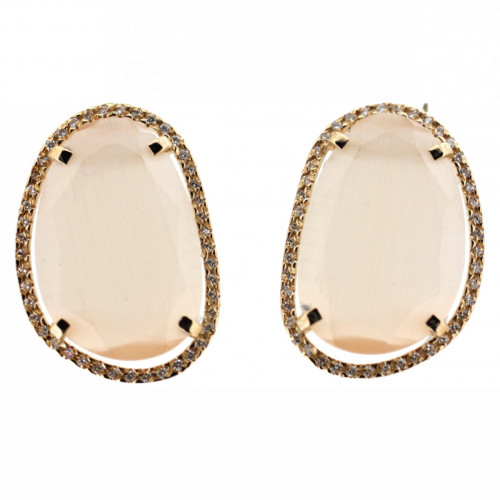 Pendientes Roseta de 21 x 15 mm Fabricados en Oro Amarillo 18 kt con Cierre de Presión y Engastados con dos Circonitas Ojo de Gato de 18 x 12 mm