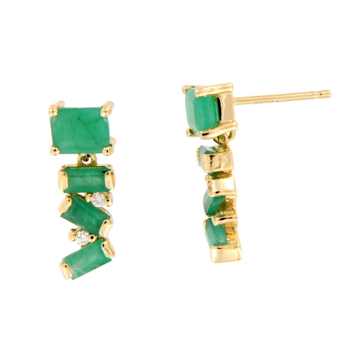 Pendientes Articulados Fabricados en Oro Amarillo 18 kt con Cierre de Presión y Engastados en Garrras con 2 Esmeraldas Naturales de 5 x 4 mm y 6 Esmeraldas Naturales de 4 x 2 mm. Largo total 15 mm. Disponible en Gargantilla.