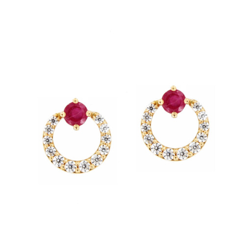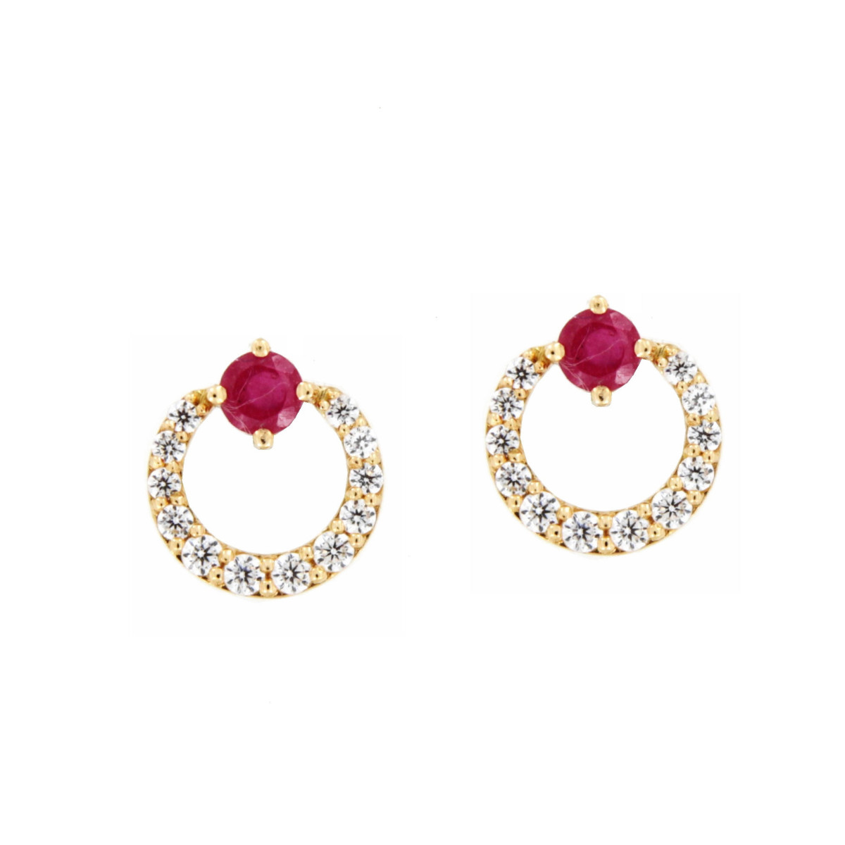 Pendientes Fabricados en Oro Amarillo 18 kt y Engastados en Garrras con 2 Rubíes Naturales de 3 mm y Circonitas.