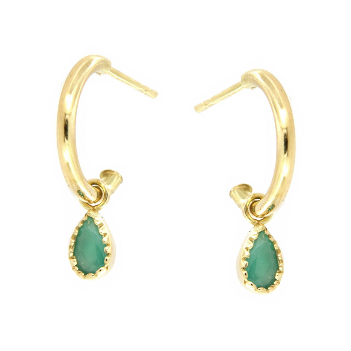 Pendientes de Aro de Tubo Redondo de 13 x 1,5 mm con Cierre de Presión y con Esmeraldas Tipo Pera de 5 x 3 mm. Fabricados en Oro Amarillo de 18Kt.