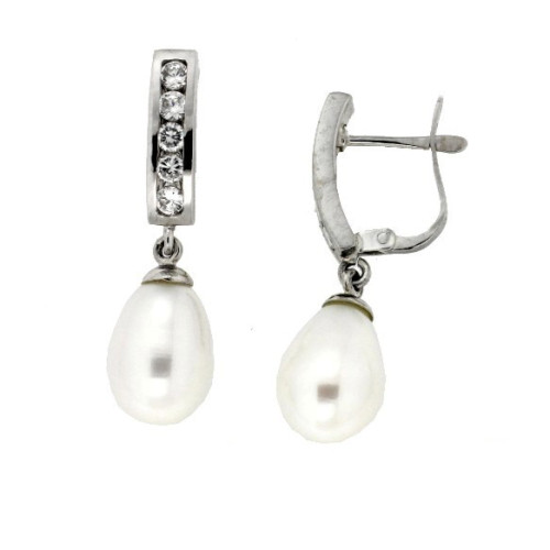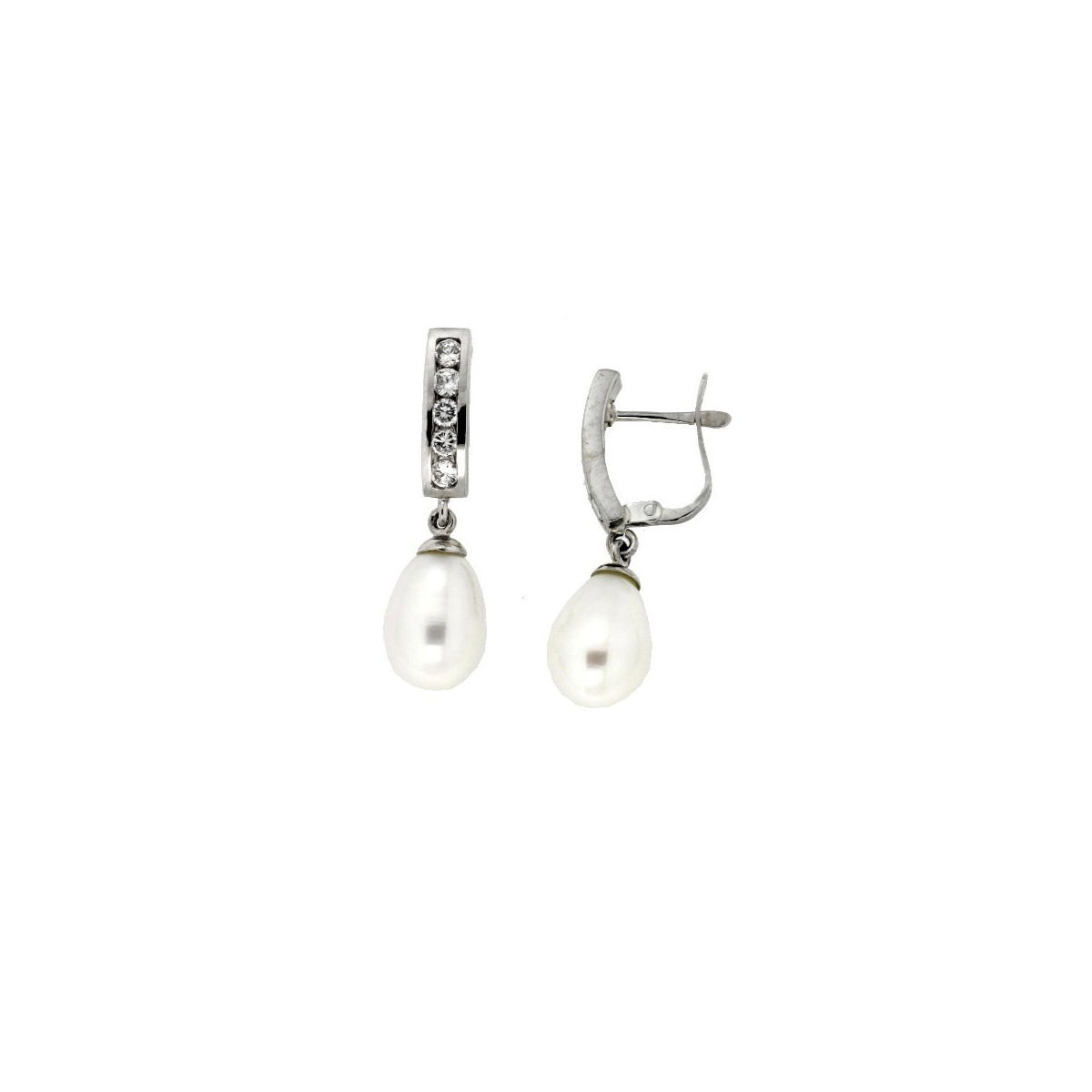 Pendientes Articulados Fabricados en Oro Blanco 18kt con Cierre de Catalán y dos Perlas Naturales 10 x 8 mm Largo total 27 mm