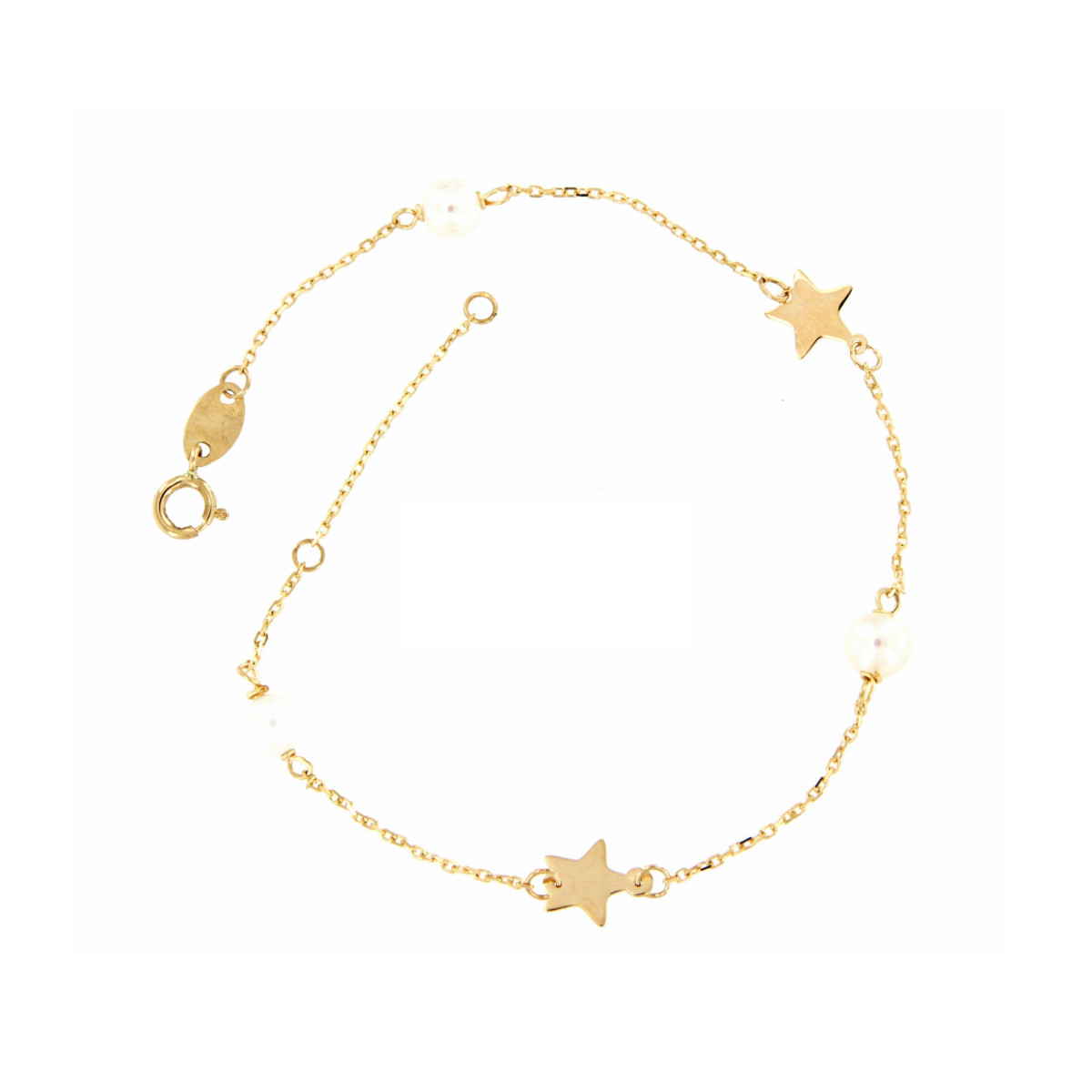 Pulsera con Estrellas de 6 mm y Perlas Chinas de 4 mm.Fabricada en Oro Amarillo 18 kt Largo 18 cm. reducción 16 cm.
