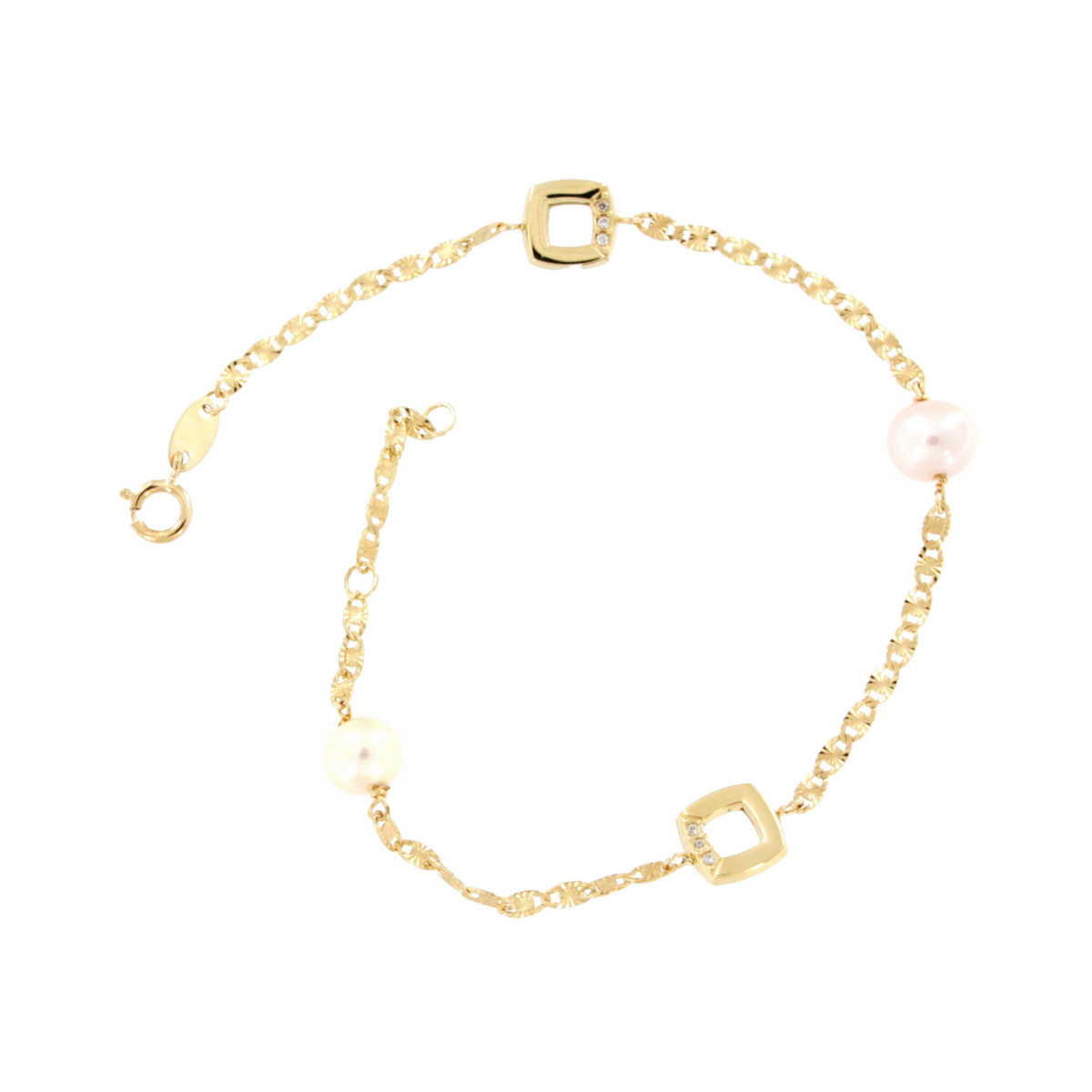 Pulsera con Cuadrados de 6,5 mm Fabricada en Oro Amarillo 18 kt con Perlas Naturales de 5,5 mm. Largo 15 - 17 cm. Disponible Pendientes